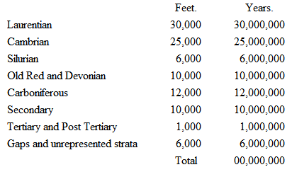 Thus Mr. T. Mellard Reade, in a paper communicated to the Royal Society in 1878, concludes that the formation of the sedimentary strata must have occupied at least six hundred million years: which he divides in round numbers as follows: —