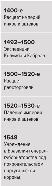 Первый португальский флот прибыл в Бразилию в 1500 году. Как и Колумб несколькими годами ранее, португальский капитан Педру Алвариш Кабрал направлялся в Индию, но, в отличие от Колумба, действительно туда попал. Кабрал не собирался совершать кругосветное плавание. Вместо этого он двигался вдоль западного побережья Африки и вокруг ее южной оконечности в Индийский океан. В попытке поймать лучшие ветры он зашел далеко в Южную Атлантику – так далеко, что, прежде чем повернуть обратно на восток, наткнулся на Бразилию. Как и Колумб, Кабрал не знал, что он нашел, но точно знал, что это не Индия. Назвав Бразилию островом Истинного Креста, Кабрал поспешил к первоначальному пункту назначения.