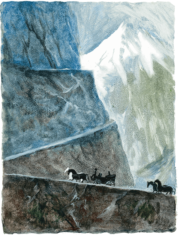 А солнце уже поднялось высоко и озолотило скаты гор, покрытые зеленью и лесом… Мы ехали теперь по узкой тропинке на самом краю ущелья. Я взглянула вниз, свесившись через край коляски, и тотчас же зажмурила глаза, испугавшись зияющей пасти черной бездны.