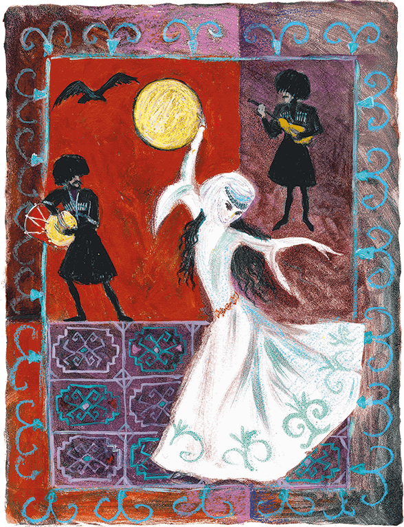 Еме подала ей бубен… Она встала, повела глазами, блестящими и тоскливыми в одно и то же время, и вдруг, внезапно сорвавшись с места и ударяя в бубен, понеслась по ковру в безумной и упоительной родимой пляске. Бубен звенел под ударами ее смуглой хорошенькой ручки, стройная ножка скользила по ковру… Она временами вскрикивала быстро и односложно, сверкая при этом черными и глубокими, как горная стремнина, глазами. Потом закружилась, как волчок, в ускоренном темпе лезгинки, окруженная, точно облаком, развевающеюся белою чадрою. Салеме, Еме, Зара и другие девушки ударяли в такт в ладоши и притоптывали каблуками.