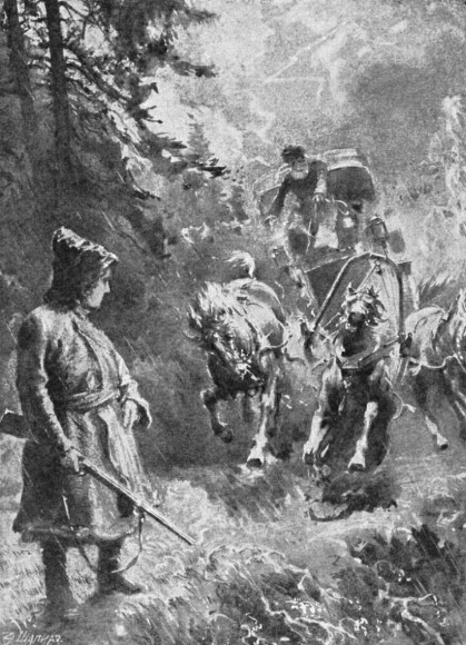 Но никакие силы не могли бы остановить вихрем мчавшейся тройки. Внезапно разыгравшаяся гроза с громовыми ударами и зигзагами молнии привела в неистовое бешенство коней. Они сломя голову неслись все вперед и вперед, с каждой минутой все ускоряя бег. Кучер едва удерживал вожжи и, до хрипоты надрываясь, кричал на одичавших от страха животных.