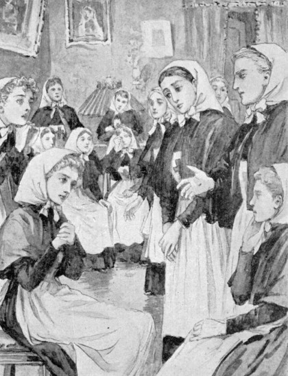 Здесь, в этой большой, просторной комнате, находилась вся община, во всем составе, бывшем налицо. Сестры сидели на стульях, диване и креслах, занимали широкие подоконники окон и принесенные из столовой бамбуковые стулья. Наконец, те, кому не хватало места, стояли в дверях и группировались у камина, весело потрескивавшего в этот зимний студеный вечер.