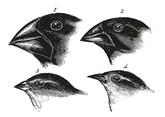 Зарисовка Дарвина: зяблики на Галапагосских островах в результате естественного отбора приобрели клювы разной формы и оказались идеально приспособлеными для раскалывания орехов различной формы, растущих на разных островах.