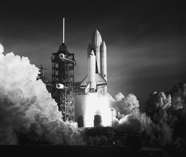 Запуск корабля многоразового использования на орбиту вокруг Земли в 1989 г. (астронавты Джон Янг и Роберт Криппен, стартовая площадка 39А, STS-1, NASA).
