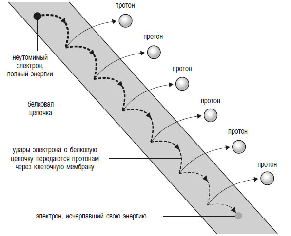 В биологии мы имеем дело с неожиданным вариантом кислородно-водородной реакции: атомы водорода в клетке отдают свои электроны атому кислорода, но три атома при этом никогда не соприкасаются. Между атомами водорода и атомом кислорода протянута длинная электропроводящая перемычка из протеиновых комплексов. Освобожденные из атома водорода электроны, которые не могут сразу отдать переизбыток энергии, вынуждены перескакивать с места на место вдоль этой перемычки.
