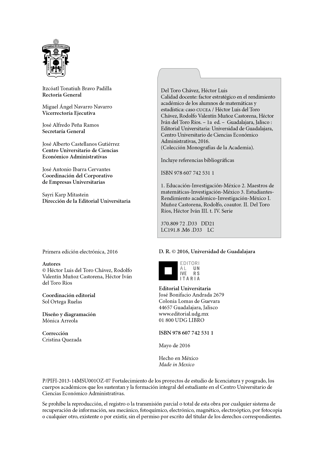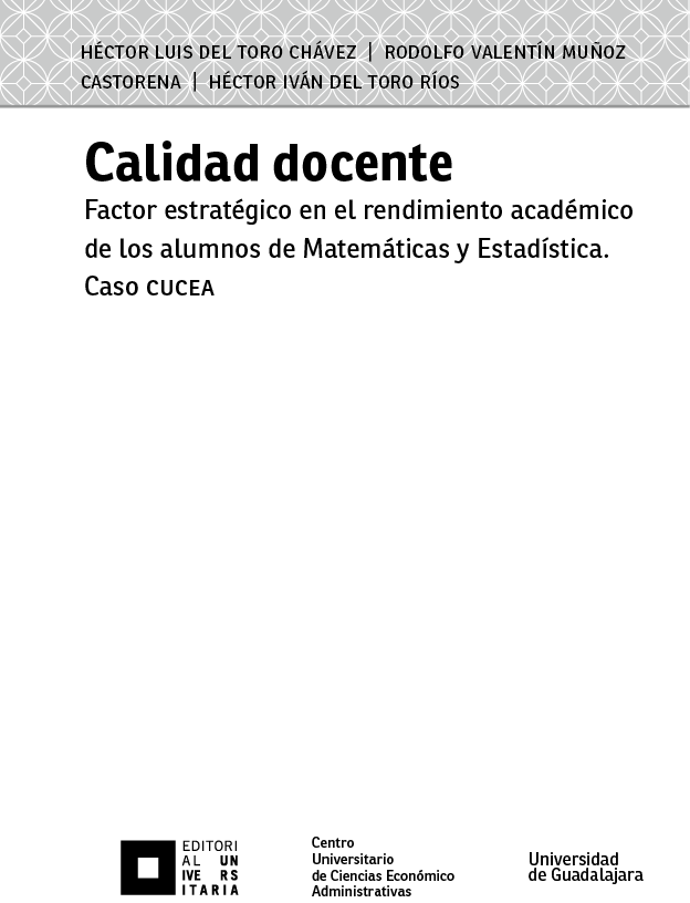 En este contexto, los propósitos que movieron a realizar la presente investigación —para obtener el grado de doctor en Metodología de la Enseñanza por el Instituto Mexicano de Estudios Pedagógicos A. C.— obedecieron a la necesidad de contar con un análisis de la situación de un problema vigente en la educación universitaria, en este caso de un miembro de la red universitaria como es el Centro Universitario de Ciencias Económico Administrativas (CUCEA), de la Universidad de Guadalajara, en torno a la calidad docente y su impacto en el rendimiento académico de los alumnos que han cursado las asignaturas de Matemáticas I y II, y Estadística I y II.