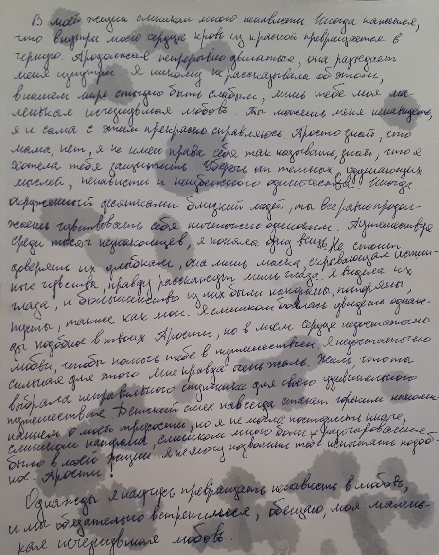 В моей жизни слишком много ненависти. Иногда кажется, что внутри моего сердца кровь из красной превращается в черную. Продолжая непрерывно двигаться, она разъедает меня изнутри. Я никому не рассказывала об этом, в нашем мире стыдно быть слабым, лишь тебе моя маленькая исчезнувшая любовь. Ты можешь меня ненавидеть, я и сама с этим прекрасно справляюсь. Просто знай, что мама, нет, я не имею права себя так называть, знай, что я хотела тебя защитить. Уберечь от темных удушающих мыслей, ненависти и неизбежного одиночества. Иногда окруженный десятками близкий людей, ты все равно продолжаешь чувствовать себя ничтожно одиноким. Путешествуя среди тысяч незнакомцев, я поняла одну вещь. Не стоит доверять их улыбкам, она лишь маска, скрывающая истинные чувства, правду расскажут лишь глаза. Я видела их глаз, и большинство из них были напуганы, потеряны, пусты, также как мои. Я слишком боялась увидеть однажды подобное в твоих. Прости, но в моем сердце недостаточно любви, чтобы помочь тебе в путешествии. Я недостаточно сильная для этого. Мне правда очень жаль. Жаль, что ты выбрала неправильного спутника для своего удивительного путешествия. Детский смех навсегда станет горьким напоминанием о моей трусости, но я не могла поступить иначе, слишком напугана, слишком много боли и разочарования было в моей жизни. Я не могу позволить тебе испытать подобное. Прости!
