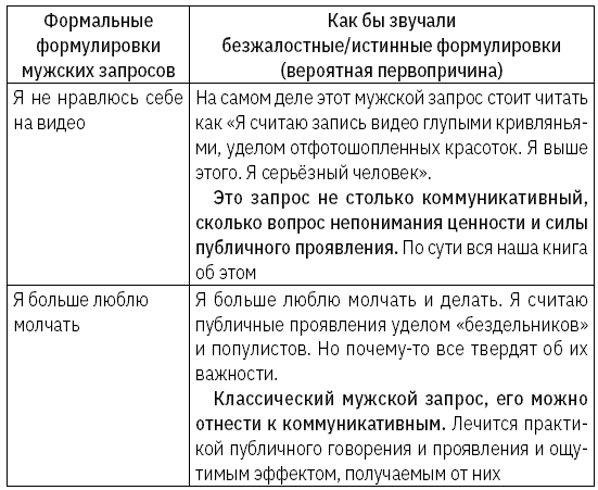 Но имейте в виду: если вы так и не решитесь стать к себе безжалостным, чтобы признать, что НА САМОМ ДЕЛЕ вы маскируете под желанием «научиться говорить красиво» (к слову, ненавижу эту формулировку – позже поговорим о её несостоятельности), то дальше эту книгу можете не читать – бесполезно. Равно как и бесполезно будет читать любые другие книги по ораторскому искусству или даже ходить на самые дорогие тренинги к самым эффективным тренерам. Без точной диагностики невозможно эффективное лечение.