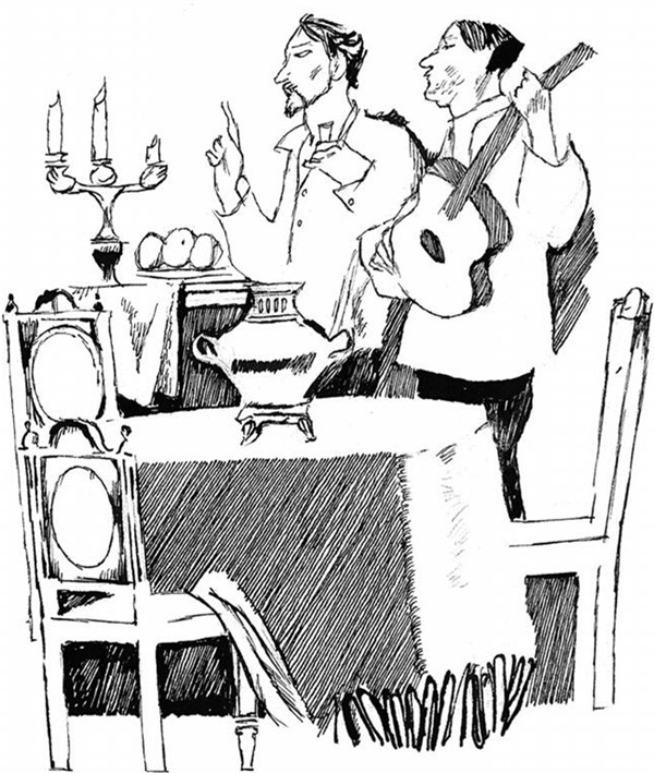 Входит Астров в сюртуке, без жилета и без галстука; он навеселе; за ним Телегин с гитарой.