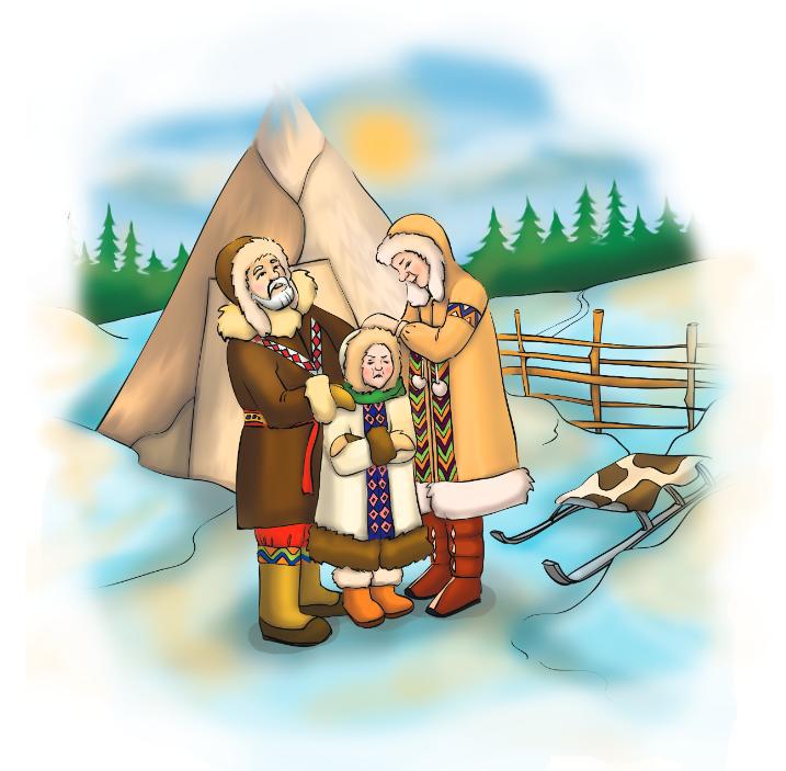 И тут заметил, что один олень как бы сторонился его, держался особняком и выглядел очень больным. Мальчик хотел заглянуть ему в глаза, но тот отвернулся. Но главное внук заметил, как две крупные слезинки скатились с его глаз, еще за этим оленем неотступно следовал старый верный пес его дедушки. Сомнений не было – перед ним его дедушка в образе оленя. Но как, как убедить его, что он уже не тот, каким был совсем еще недавно, а прежний любящий и заботливый внук. Решение пришло само собой. Необходимо просто поговорить с дедом, объяснить ему все, но говорить так искренне, как не говорил никогда и ни с кем. И он упал перед дедом – оленем на колени и заговорил. Рассказывал, насколько сильно им с бабушкой не хватает его, как он раскаивается за свое прежнее поведение. С самого начала монолога, как только он заговорил, дед-олень развернулся и медленно стал удаляться прочь, но постепенно шаги его становились все медленнее и медленнее. Внук вскочил, подбежал к нему, крепко обнял за шею и заплакал так сильно, что ничего не видел из-за слез перед собой. А когда перестал плакать и немного успокоился, то увидел, что обнимает не оленя, родного дедушку. Так, обнявшись, они дошли до своего чума, а вскоре и бабушка поправилась. Потому что в чуме опять поселились взаимопонимание и любовь, а любовь способна делать чудеса.