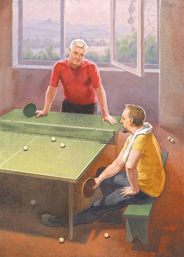 – Саня, Саша, извиняюсь, ха-а кха-а… Александр! Ты сам, вообще-то, понимаешь, что при желании можешь в игре вытворять? Нет, ну вы только полюбуйтесь на это, люди добрые! Я ему по-человечески, всё в столик. Нате, кушайте! А в ответ что происходит? Ловите-ка, дядя Серёжа, мощнейший топс в самый край, в белую линию! Мне как спасаться прикажешь, милый друг? Не стыдно тебе ни капельки? Совесть вообще у вас имеется, молодой человек? Я же как кролик перед удавом. Дальше – больше! Если получается у меня вдруг с перепугу возвращать, тут начинается просто невообразимый ахтунг! Спрашивается, зачем брал? Моментально получаю оплеуху в противоположный угол! Нет, совершенно нету у тебя совести, давно надо было мне это понять! А-я-яй… Так, по-твоему, честно с пенсионерами поступать? Я чувствую себя форменным гривотрясом! Ты что, под старость лет Мышкина из меня решил сделать? Кидать по углам – это же риск, когда проигрываешь 8:10! Или как, уже ничего не боишься? Появилось чувство мяча? Не рано, а? – Сергей Александрович задорно хихикнул и сощурил один глаз, но Саша давно знал, что такое ворчание тренера на самом деле означает похвалу, и по привычке не стал ничего отвечать. Он просто пожал плечами и, театрально вздохнув, будто извиняясь, развёл в стороны руки.