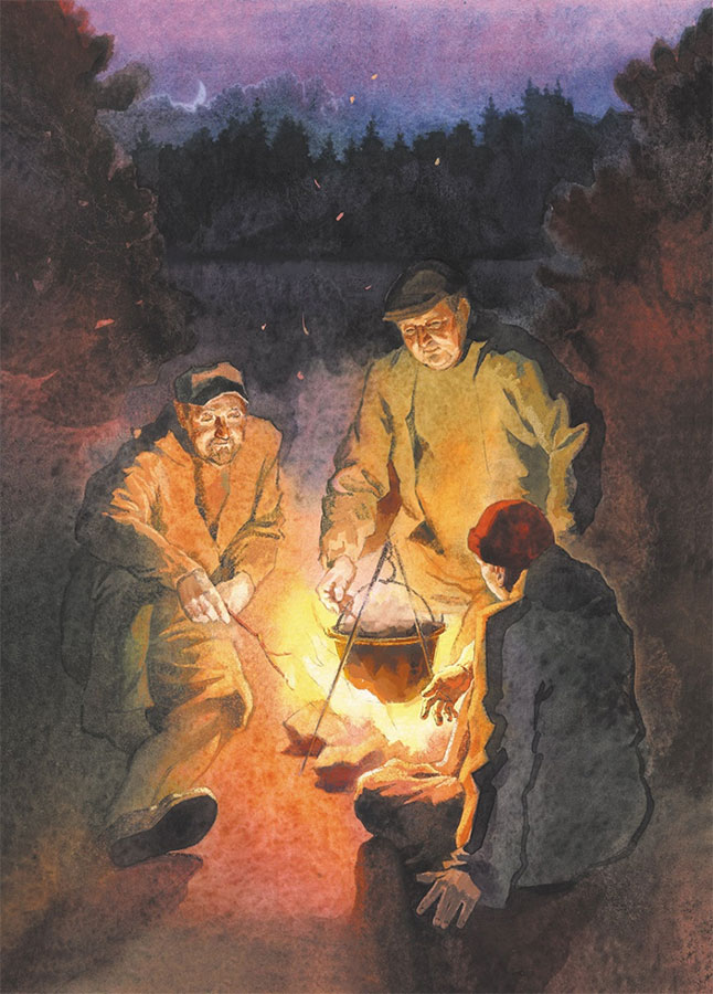 Были тихие, погожие сумерки. Потрескивал костёр, над которым на толстой ветке приладили котелок с похлёбкой. Синеватый прозрачный дымок в неподвижном воздухе зыбким столбом медленно поднимался вверх. Усталый день мягко догорал багровым янтарём на горизонте. Они полулежали рядом с огнём. Над рекой мутными пластами стелился волнистый туман.