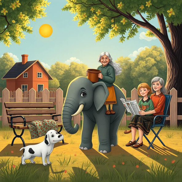 Мелком рисую на асфальтеСкамейку, дом, заборчик, садик,Собачку, солнышко, теленка,С ведром Бабулю на слонёнке,На кресле Дедушку с газетой,В машине Папу за беседой,Братишку младшего – Андрюшку,И Маму со своей подружкой.Мне мама говорит с улыбкой:– Здесь нарисована ошибка. Слонёнка нету у Бабули. «Слонёнок» у неё – Дедуля.«Нет!» – я упрямо отвечала:– Дедуля помогает мало.Он вечно держится за спину,Не носит лейку и корзину.Слонёнок помогал бы очень:Он не храпел бы громко ночью,Полил бы овощи и фрукты,Привез бы Бабушке продукты.Окошки вымыл бы старушке,От пыли выбил все подушки.Не надо для него готовить,Он травку пожевал бы в поле.Бабуля б много отдыхала,Рассказывать мне сказки б стала.Слонёнок нужен, точно знаю.О нём все Бабушки мечтают.