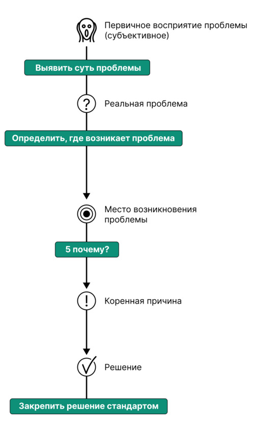 При этом без описанных и выстроенных процессов эффективность семи шагов и «5 почему» будет радикально снижаться. Как вы поймете, в каком процессе проблема? А главное, что вы будете менять, чтобы она не повторилась? Забегая вперед, обозначу еще один инструмент – «6 сигм». Он нужен для того, чтобы вы понимали границы управляемости вашего процесса и не бежали перестраивать всю организацию после каждого чиха.