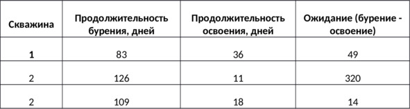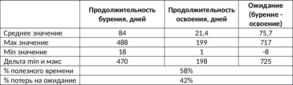 – Мы не имеем информации о глубинах скважин и не можем оценить эффективность рабочего процесса. Однако мы можем сопоставить время простоя между окончанием бурения и началом освоения. Так, средний срок ожидания от момента окончания бурения до начала освоения – 76 дней. При этом среднее ожидание начала освоения превышает средний срок освоения более чем в 3,5 раза и сопоставим по времени со всем процессом бурения. Суммарно потери ожидания составляют 42% времени от всего цикла с момента начала бурения до окончания освоения. Это генерирует как упущенную прибыль, так и прямые потери.