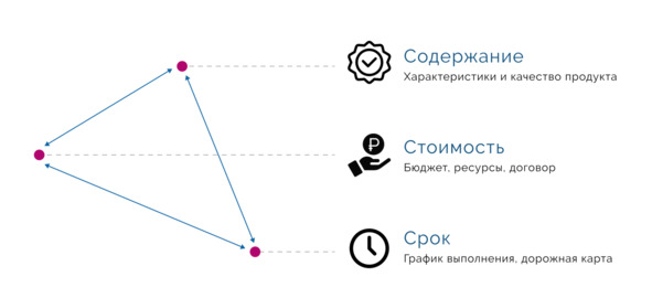 Суть этого треугольника в том, что вы не можете изменить содержание проекта (кроме редких случаев) без изменения сроков или бюджета. Или не можете сократить срок, не изменив бюджет (для привлечения дополнительных людей, например) или содержание. То есть любое ваше желание непременно скажется на содержании, сроках или стоимости.
