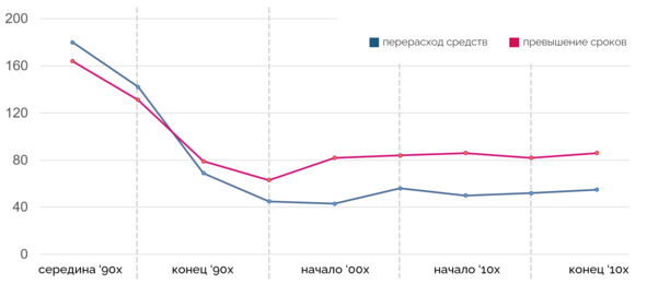 Еще интереснее выглядит статистика превышения сроков и перерасходов.