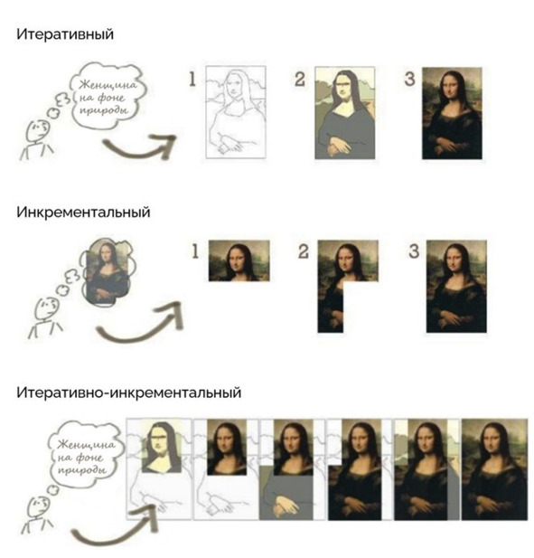 В свою очередь гибкие подходы тоже можно разложить также на 3 типа: итеративные, инкрементальные, итеративно-инкрементальные.