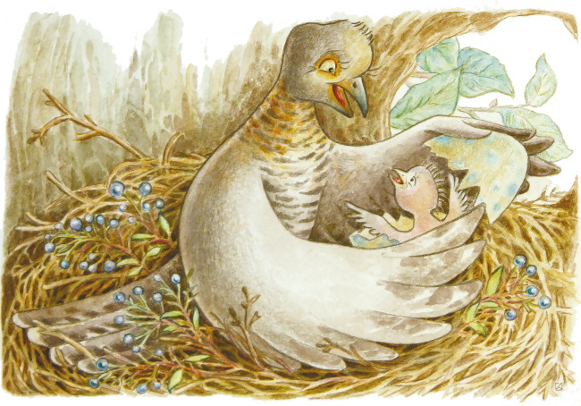 Время шло, а Кукушка всё медлила. Хорошо было ей в дупле с ещё не вылупившимся птенчиком. Возвращаясь, она прижимала его к себе и пела старинную песню: ку-ку, ку-ку. И вот однажды под звуки маминого голоса скорлупка затрещала и показалась маленькая лысая головка кукушонка – он был прекрасен! Увидев мать, он сразу беспомощно прижался к ней. Кукушка обнимала этот маленький, тёплый, беззащитный комочек и плакала. «Как же я смогу оставить его?» – думала она.