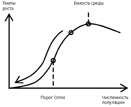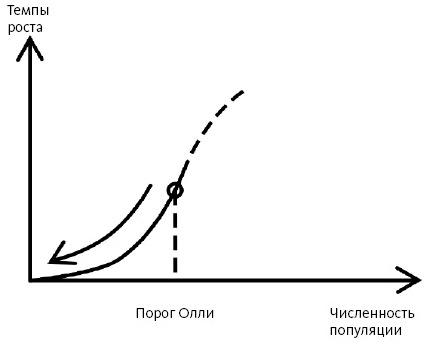 Когда в банде недостаточно сурикатов, возрастает вероятность того, что одна из особей попадется в лапы хищнику. Возникает замкнутый круг: сурикатов становится меньше, их способность к самозащите падает, и колония уменьшается снова. Когда численность популяции оказывается ниже порога Олли, она начинает стремиться к нулю.