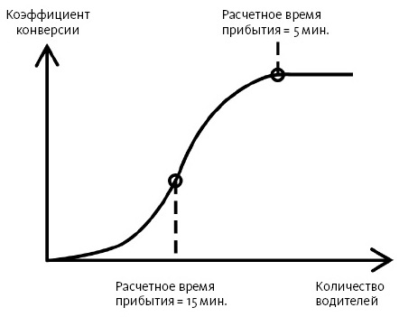 Когда в городе мало водителей, дожидаться машину приходится очень долго. Это называется высоким ETA (расчетное время прибытия). Коэффициент конверсии при этом низкий, потому что никто не хочет ждать такси полчаса. Таким образом, если у вас нет нескольких десятков водителей – допустим, полусотни, – ценность вашего сервиса для пассажиров будет почти нулевой. Пользоваться приложением перестанут и клиенты, и водители, и вся сеть разрушится сама собой.