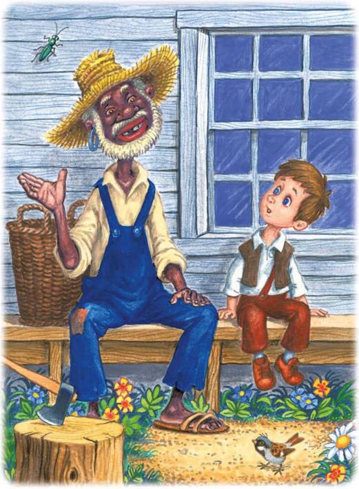 Как-то вечером мама долго искала своего сынишку. Джоэля не было ни в доме, ни во дворе. Она услышала голоса в старой хижине дядюшки Римуса, заглянула в окно и увидела, что мальчик сидит рядом со стариком.