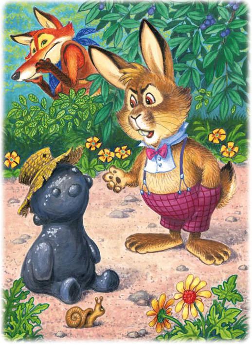 Вот Кролик отскочил назад, размахнулся и как стукнет Чучелко по голове кулаком! Кулак прилип, никак не оторвёшь его: смола держит крепко.