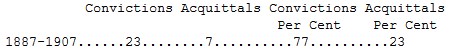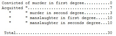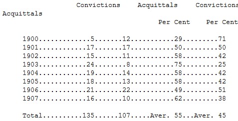 It is distinctly interesting to compare this with the table showing the results of all the homicide trials for the past eight years irrespective of the sex of the defendants: