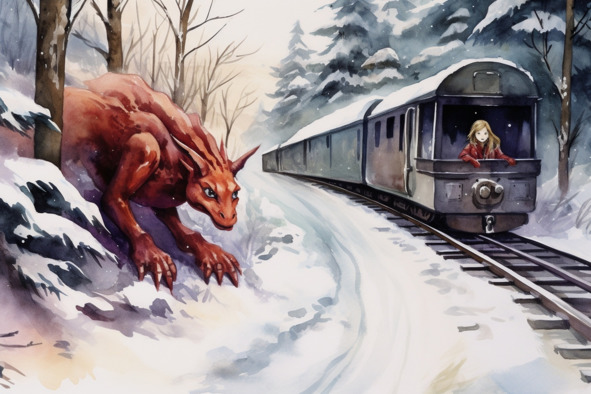 Всю ночь шнырял Тит от облака к облаку в своей тайной погоне за поездом. Чуть рассвет забрезжил, догнал-таки! Но тут уж не до полётов – ныряем в дебри лесные и оттуда нос драконий не кажем! Конечно, трудно такой тушке красной незаметной на снегу оставаться. Тут хоть под сугробы лезь, как крот-переросток под землю! Но делать нечего. Ни уменьшиться, ни невидимым стать Тит не может, пока на шее ошейник волшебный бряцает. Будь он неладен!