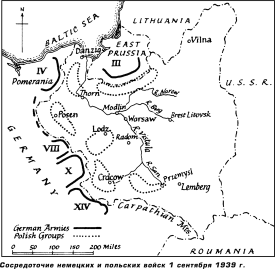 По численности и вооружению польская армия не могла тягаться с наступавшим противником, да и диспозицию ее нельзя было признать разумной. Все польские вооруженные силы были разбросаны вдоль границ Польши. Резервов в центре не было. Гордо и высокомерно отвергая германские притязания, поляки тем не менее боялись, как бы их не обвинили в провокации, если они проведут мобилизацию заблаговременно, чтобы противостоять накапливавшимся вокруг них силам. 30 дивизий, представлявших лишь две трети польской действующей армии, были готовы или почти готовы принять на себя первый удар. Быстрота, с которой развивались события, и энергичное вмешательство германской авиации не позволили остальной части польских вооруженных сил выйти на передовые позиции, пока все не было кончено, и они приняли участие лишь в последних фазах катастрофы. Таким образом, на большом протяжении 30 польских дивизий оказались лицом к лицу с почти вдвое превосходящими силами, не имея за своей спиной никакого прикрытия. Они уступали немцам не только численно; они сильно отставали и в артиллерии, а девяти германским танковым дивизиям они могли противопоставить лишь одну бронетанковую бригаду. 12 бригад польской кавалерии мужественно атаковали полчища танков и бронемашин, но не могли причинить им вреда своими саблями и пиками. 900 самолетов первой линии, из которых, пожалуй, лишь половина была современной конструкции, были захвачены врасплох, а многие уничтожены еще на земле.