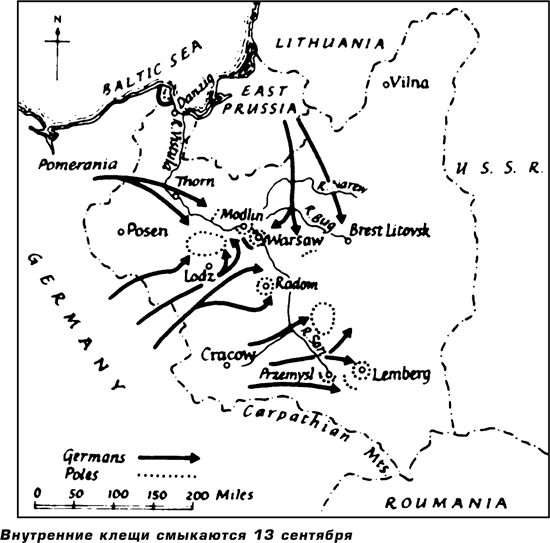 Внутри этих варшавских клещей сражалась и гибла польская армия. К ее познанской группе присоединились дивизии из торуньской и лодзинской групп, отброшенные натиском немцев. Теперь познанская группа насчитывала 12 дивизий, и через ее южный фланг 10-я германская армия стремительно шла на Варшаву, защищенная лишь относительно слабой 8-й армией. Уже находясь фактически в окружении, польский командующий познанской группой генерал Кутшеба решил ударить на юг по флангу основных германских сил. Эта смелая польская контратака, известная под названием «Битва на реке Бзура», вызвала кризис, захвативший не только германскую 8-ю армию, но и часть 10-й, отвлеченной от наступления на Варшаву, и даже корпус 4-й армии с севера. Под натиском всех этих мощных сил, под сокрушительными ударами с воздуха, не встречавшими никакого сопротивления, познанская группа десять дней вела свою славную борьбу. 19 сентября она была окончательно стерта с лица земли.