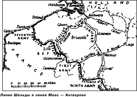 * * *В мире не найдется другой границы, которая была бы предметом столь пристального внимания стратегов и изучалась бы так тщательно, как проходящая через Бельгию и Голландию граница между Францией и Германией. Каждая пядь этого района, все расположенные здесь холмы и прорезывающие его водные пути – все это столетиями каждый раз изучалось в свете последней военной кампании всеми генералами и во всех военных академиях Западной Европы. В тот период существовало две линии, на которые союзники могли выдвинуться, если бы Германия вторглась в Бельгию и они решили бы прийти последней на помощь, или которые они могли бы занять по приглашению Бельгии на основе тщательно разработанного, тайного и рассчитанного на внезапность плана. Первую линию можно назвать линией Шельды. Расположена она была на сравнительно близком расстоянии от французской границы, и выход к ней не представлял сколько-нибудь серьезной опасности. На худой конец не вредно было бы занять эту линию в качестве «ложного фронта». В лучшем же случае этот фронт можно было укрепить в зависимости от хода событий. Вторая линия представляла гораздо больший интерес. Она пролегала вдоль Мааса, через Живе, Динан, Намюр и Лувен и кончалась в Антверпене. Если бы союзники захватили эту многообещающую позицию и удержали ее в ожесточенных боях, немецкий удар справа наткнулся бы на мощную преграду. Если бы германская армия оказалась слабее союзных, выход на эту линию послужил бы великолепной прелюдией к захвату Рура – сердца немецкой военной промышленности.