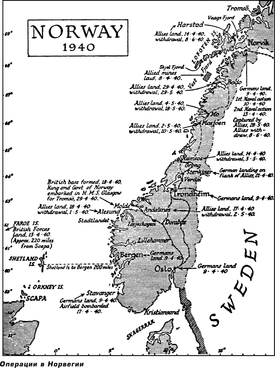Теперь заговорил я, впервые на заседаниях этого органа, указав на трудности, связанные с высадкой войск и выгрузкой различного войскового снаряжения на виду у самолетов и подводных лодок противника. Хотя к этому времени уже удалось благополучно высадить 13 тысяч человек, союзники еще не создали баз и действовали на суше, располагая ненадежными линиями коммуникаций и практически без артиллерии и без авиационной поддержки. Таким было положение в Центральной Норвегии.