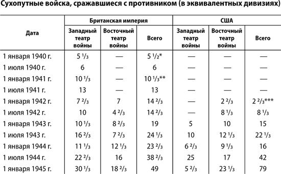 *** Исключая филиппинские войска. За разграничительную линию между восточным и западным театрами войны принята линия, проходящая с севера на юг через Карачи. В театры войны не включены следующие районы: северо-западный пограничный район Индии, Гибралтар, Западная Африка, Исландия, Гавайи, Палестина, Ирак, Сирия (за исключением данных на 1 июля 1941 г.). Мальта включена в театры войны; Аляска также с января 1942 г. по июль 1943 г. Иностранные контингенты – например, свободные французы, поляки, чехи – не включены.