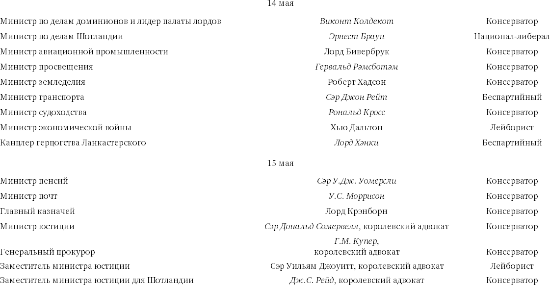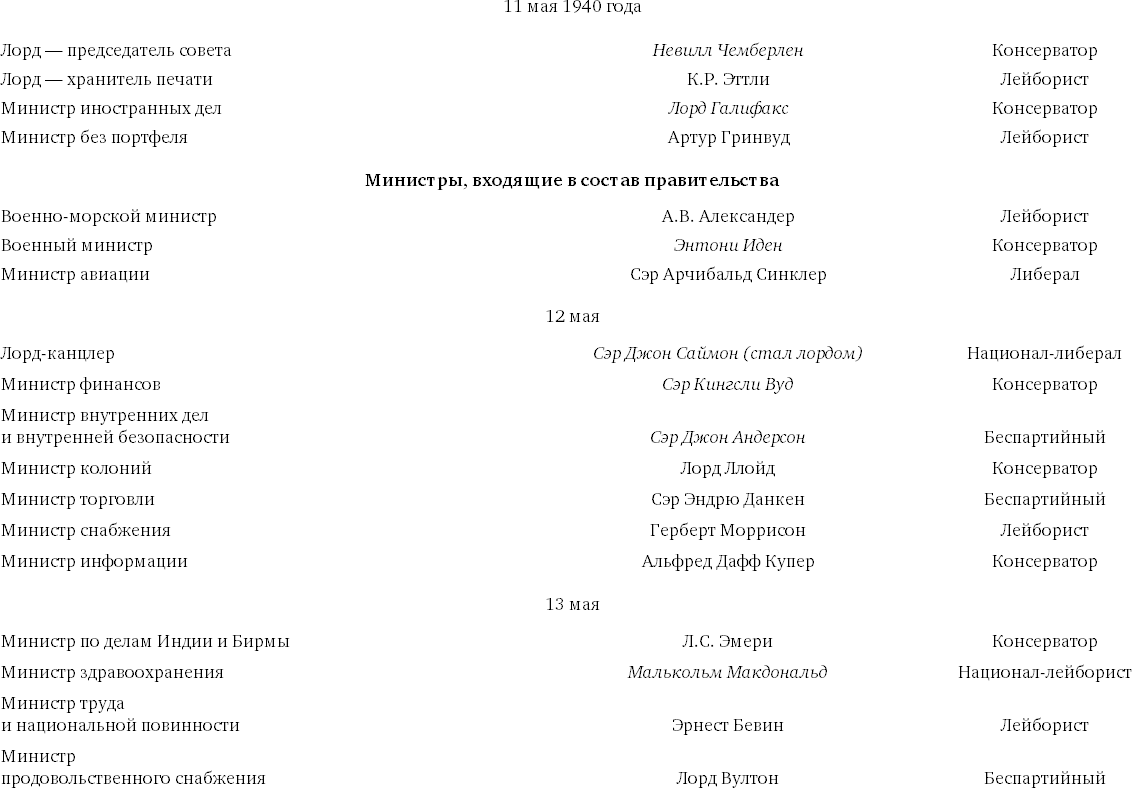 Я предложил Чемберлену возглавить палату общин в роли лорда – председателя совета. Он ответил по телефону, что принимает предложение, и сообщил, что в тот же вечер, в 9 часов, выступит по радио с заявлением о своей отставке и с призывом поддержать его преемника и помочь ему. Все это он сказал в самых великодушных выражениях. Я попросил лорда Галифакса стать членом военного кабинета, сохраняя одновременно пост министра иностранных дел. Примерно в 10 часов я послал королю список пяти фамилий, как обещал. Было крайне необходимо назначить трех военных министров. Я уже решил, кого назначить. Иден должен бы получить военное министерство; Александер – военно-морское министерство и лидер либеральной партии Арчибальд Синклер – министерство авиации. В то же время я брал себе портфель министра обороны, не пытаясь, однако, определить масштабы его полномочий.