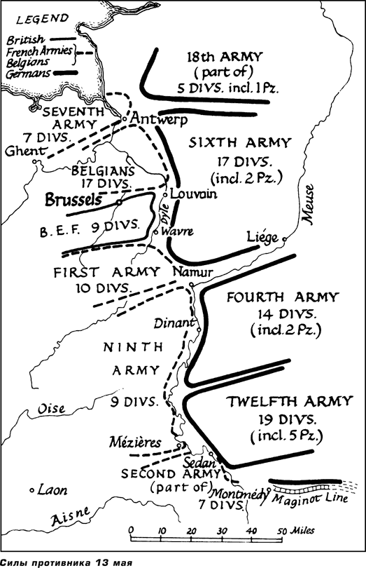Однако в течение дня 13 мая штабу лорда Горта стало известно о масштабах германского удара на фронте французской 9-й армии. К ночи враг укрепился на западном берегу Мааса по обеим сторонам Динана и Седана. Французское командование все еще не было уверено, куда направлен главный удар немцев – через Люксембург против левого крыла линии Мажино или же через Маастрихт на Брюссель. На всем протяжении фронта (от Лувена, Намюра, Динана до Седана) шли интенсивные тяжелые бои, однако они проходили не так, как предполагал генерал Гамелен, поскольку у Динана французская 9-я армия не успела укрепиться до наступления противника.