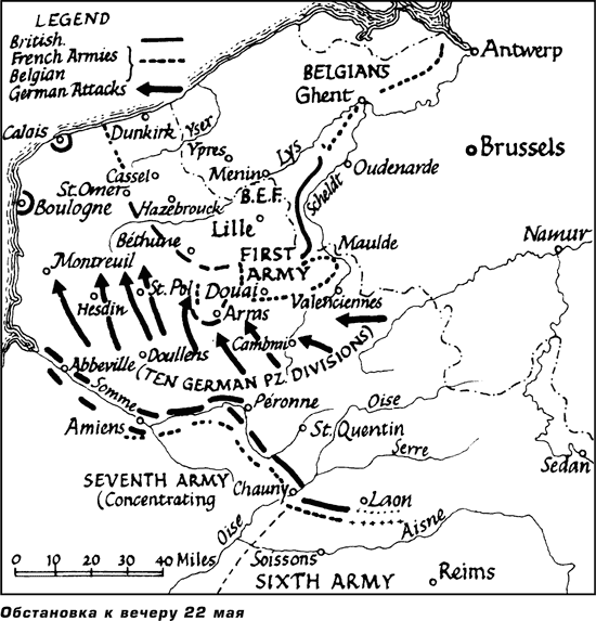 В результате отсутствия какого-либо верховного руководства военными действиями случайности и противник стали управлять событиями. 17 мая Горт начал посылать войска на линию Рюйолькур, Арле и занимать Аррас, постоянно усиливая свой южный фланг. Французская 7-я армия, без 16-го корпуса, который понес очень большие потери в боях за Валхерен, продвинулась на юг с целью соединения с французской 1-й армией. Она пересекла тыл англичан, не причинив им серьезных помех. 20 мая противник форсировал Шельду у Уденарда, и три английских корпуса, которые все еще были развернуты на восток, 23 мая отошли на ту линию обороны, которую мы создали вдоль бельгийской границы зимой и с которой наши корпуса так энергично начали свое наступление за 12 дней до этого.
