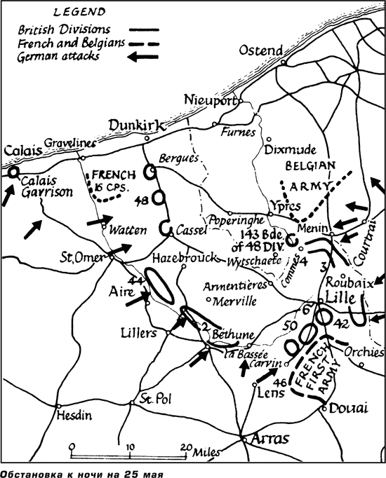 К 23 мая 1-й и 2-й корпуса английских экспедиционных сил, последовательными этапами выводившиеся из Бельгии, снова оказались на линии пограничных укреплений к северу и востоку от Лилля, которые они сами для себя построили в течение зимы. Взмах германской косы прошел вдоль нашего южного фланга и достиг моря. И нам необходимо было прикрыть себя. Сложившаяся обстановка вынудила Горта и его штаб послать войска, которые с успехом заняли позиции по линии канала Ла-Бассе – Бетюн – Эр – Сент-Омер – Ваттен. Эти войска вместе с частями французского 16-го корпуса вышли к морю у Гравлина. Английский 3-й корпус был главной силой этого вогнутого фронта, развернувшегося на юг. Непрерывной линии фронта не было; было лишь множество оборонительных «точек» на узлах основных дорог, и некоторые из них, например Сент-Омер и Ваттен, уже попали в руки врага. Чрезвычайно важные дороги к северу от Касселя оказались под угрозой. Резерв Горта состоял всего из двух английских дивизий, 5-й и 50-й, которые, как мы видели, только что едва выбрались из боя на юг от Арраса, предпринятого ими в бесплодной попытке выполнить план Вейгана. В этот день общая линия фронта английских экспедиционных сил составляла около 90 миль, причем всюду в тесном соприкосновении с противником.