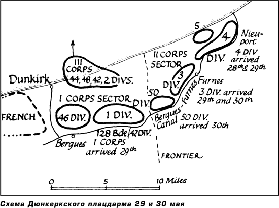 Тем временем занятие плацдарма вокруг Дюнкерка проводилось с большой точностью. Войска прибывали из хаоса и располагались вдоль укреплений, которые даже возросли за эти два дня. Части, находившиеся в наилучшем состоянии, были включены в боевой порядок. Наиболее пострадавшие дивизии, такие как 2-я и 5-я, оставались в резерве на побережье и вскоре были погружены на корабли. По первоначальным расчетам на фронте должны были быть три корпуса, но к 29 мая выяснилось, что достаточно двух корпусов, поскольку французы приняли в обороне большое участие. Противник преследовал отступающих по пятам, и все время происходили ожесточенные бои, в особенности на флангах, вблизи Ньивпорт и Берга. В ходе эвакуации постоянное уменьшение численности войск, как английских, так и французских, сопровождалось соответствующим сужением фронта обороны. На побережье, среди песчаных дюн, десятки тысяч солдат находились по 3, 4 или 5 дней под неослабевающими воздушными налетами.