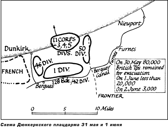 * * *30 мая офицеры штаба лорда Горта, совещавшиеся с адмиралом Рамсеем в Дувре, сообщили ему, что восточную часть плацдарма можно удерживать только до 1 июня. Эвакуация была максимально усилена, чтобы оставить на берегу, если это возможно, английский арьергард численностью не более четырех тысяч человек. Позднее выяснилось, что такой арьергард недостаточен для обороны последних позиций прикрытия, и было решено удерживать английский сектор до полуночи 2 июня, проводя тем временем эвакуацию французских и английских войск на основе полного равенства.