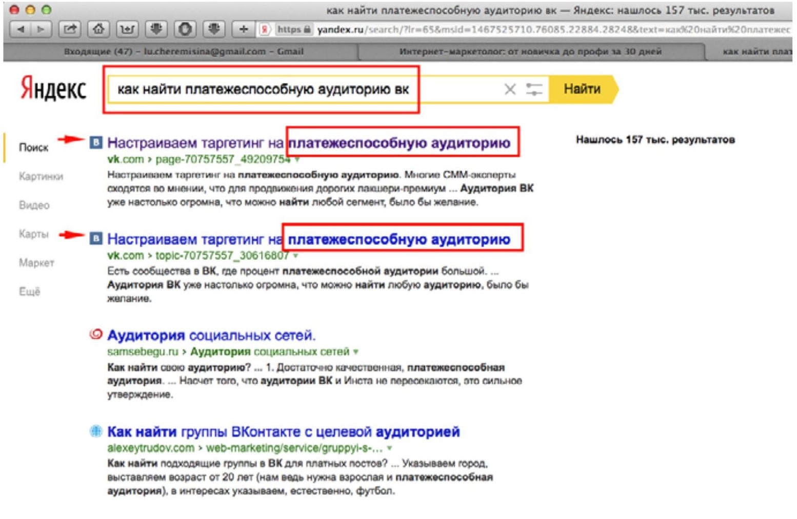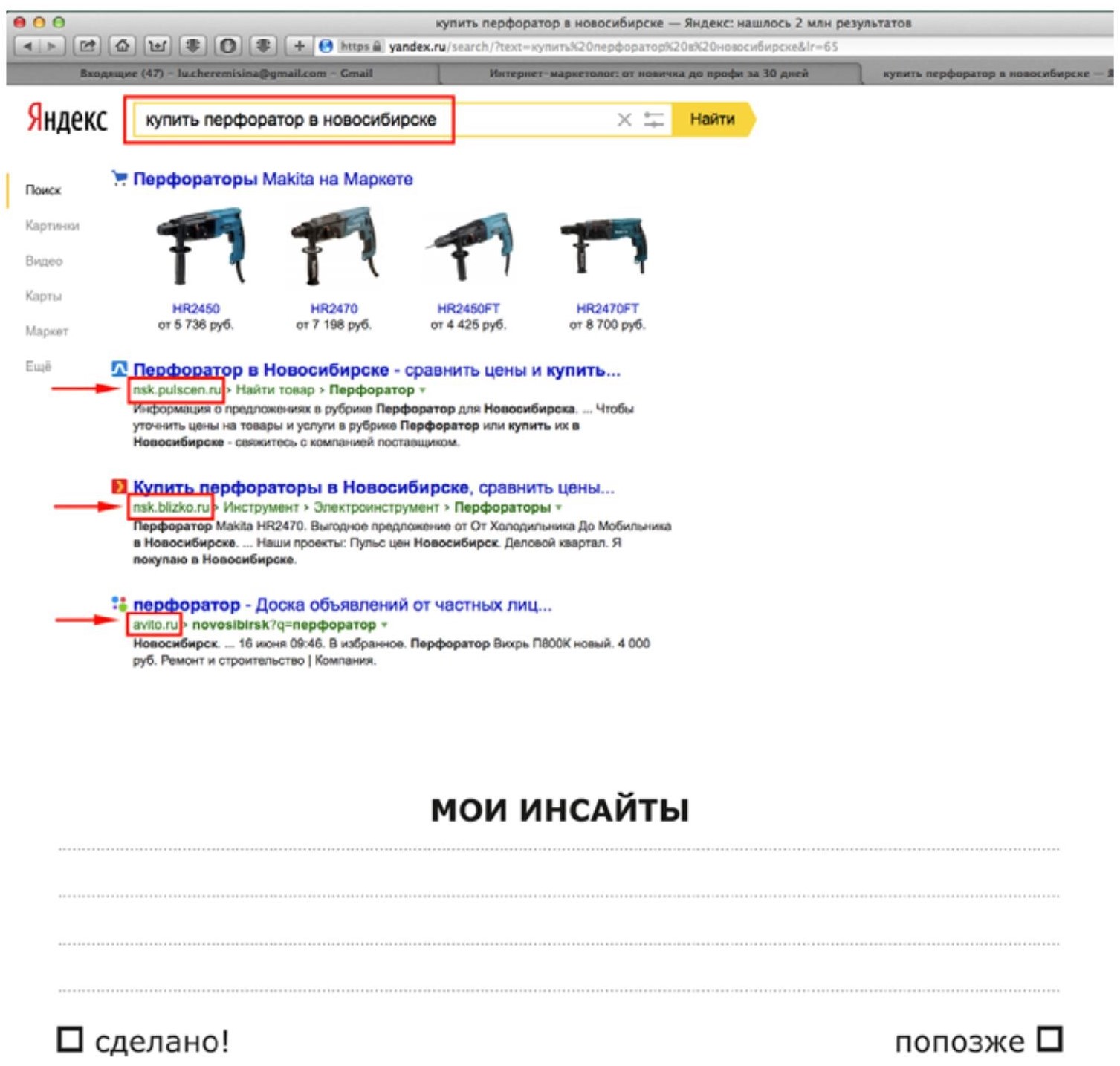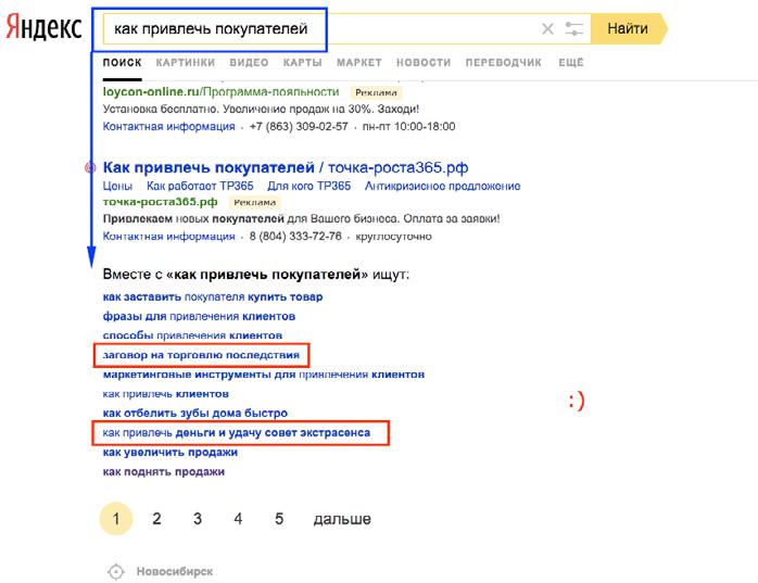 Я иду в Яндекс: мне интересно исследовать поведение таких людей в интернете. Я хочу узнать, что люди еще ищут вместе с запросом «как привлечь покупателей» – и именно косвенные вопросы расскажут мне больше об этих людях.