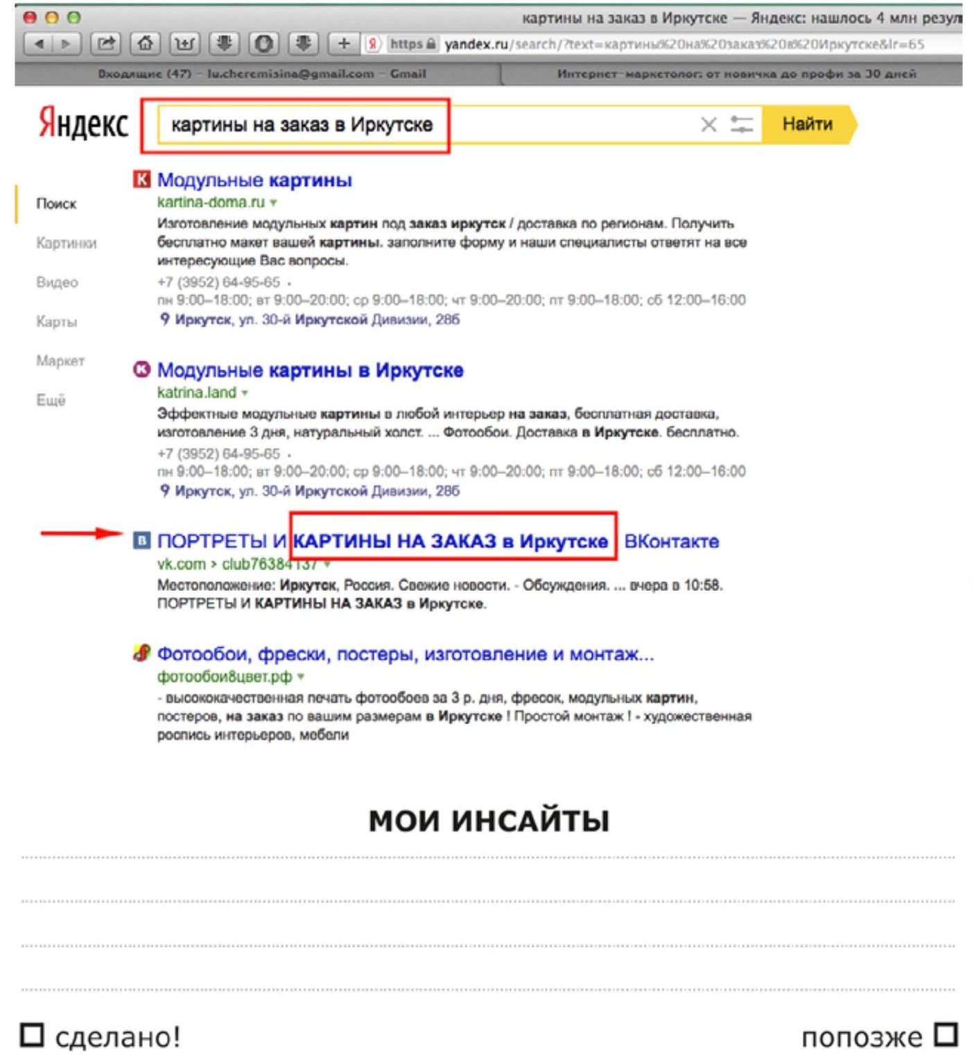 Идея 6 для тех, у кого есть группа в ВКонтакте. Я предлагаю обратить внимание на название вашей группы – содержится ли в нем ключевой запрос, по которому ваши товары и/или услуги ищут ваши клиенты? Например, если вы продаете картины, написанные маслом под заказ в г. Иркутске, то предлагаю вашу группу назвать «Картины маслом под заказ в г. Иркутске». Во-первых, это повысит вашу позицию во внутреннем поиске в ВКонтакте, даже если у вас сравнительно небольшое количество подписчиков, но внутри группы ведется активная деятельность. Во-вторых, социальные сети качественно индексируются поисковыми системами, поэтому ссылка на вашу группу появится, в том числе, в топ10 по этому ключевому запросу. Проверяйте и внедряйте. Удачи.