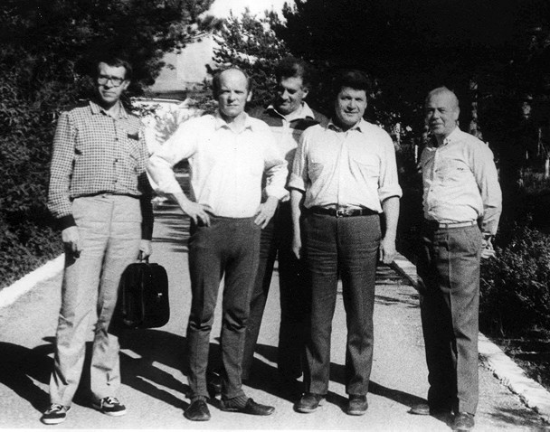 Илл. 16. На Крымской станции ГАИШ. 1980 г. Слева направо: В. А. Липовецкий, В. Л. Афанасьев, М. А. Аракелян, А. М. Черепащук, А. К. Кривошеин