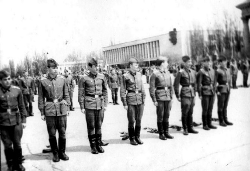 В один из дней апреля на каком-то батальонном построении комбат объявил на, что мы девятого мая, на День Победы будем выступать на центральной площади Ставрополя с оружейными приёмами. И стали мы почти каждый день по утрам тренироваться на плацу этим самым приёмам. Брали в руки автомат, проделывали с ним различные движения, типа – «Бей! Коли! На пле-чо!». Развороты в движении и многое другое. Замотались мы с этими автоматами, а Лёлик не унимается, лично проводит тренировки. Накануне выступления отобрал комбат лучших, по его мнению. Я в это количество не попал. А «счастливцы» в День Победы шагали на площади с автоматами, демонстрировали зрителям мастерское владение оружием и, как говорят, даже сорвали аплодисменты. Это даже показывали по местному телевидению.