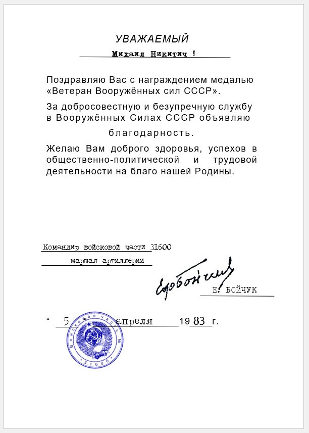 «Уважаемый Михаил Никитич! Поздравляю Вас с награждением медалью «Ветеран Вооружённых Сил СССР». За долголетнюю и безупречную службу в Вооружённых Силах СССР объявляю благодарность. Желаю Вам доброго здоровья, успехов в общественной и трудовой деятельности на благо нашей Родины.