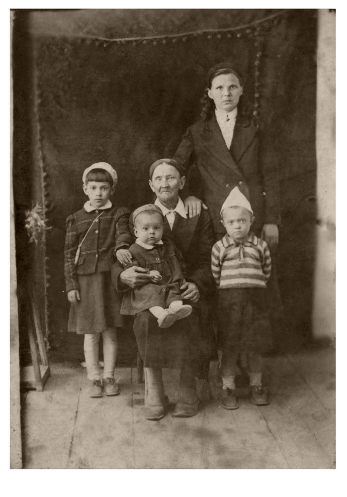 Апрель 1945г, Н.Тагил, перед отправкой в детский дом Н.Асбест. Мачеха Полина Семёновна Мельникова, бабушка – мама папы, Тася, Толик, Валя.