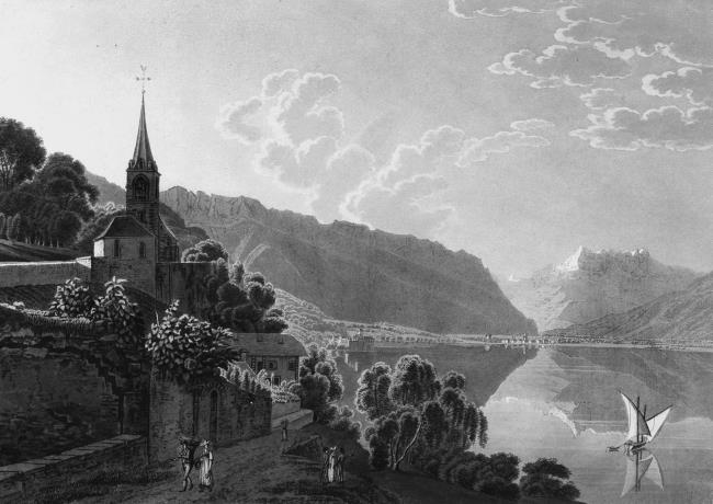 Вид в окрестностях швейцарского Монтрё. Старинная литография