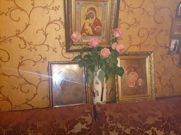 У иерея Анатолия (Царство ему небесное) отобразилась икона на стекле (слева) Он молился и читал Псалтырь перед иконой Пресвятой Богородицы Казанскою (справа), которую сам написал, а Матерь Божия сама себя запечатлела на стекле, которое раньше было на его иконе.