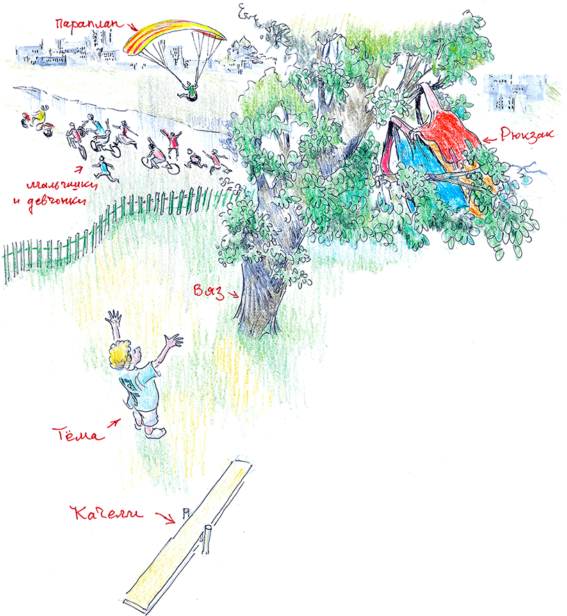 Во дворе под вязом стоял брат Маши Тёма, рыжий мальчик двенадцати лет, в шортах ниже колен, кроссовках, бейсболке и футболке с номером «7» и буквами «Б-Б», что значило Белосельский-Белозерский. Тёма с горечью объяснял родителям, что больше никогда, никогда не сможет пойти в школу! В рюкзаке, который неизвестно как оказался высоко в ветвях, его учебники, ручки, карандаши, дневник, роликовые коньки, а, главное, все уроки, приготовленные на неделю вперёд! Он громко всхлипывал от отчаяния.