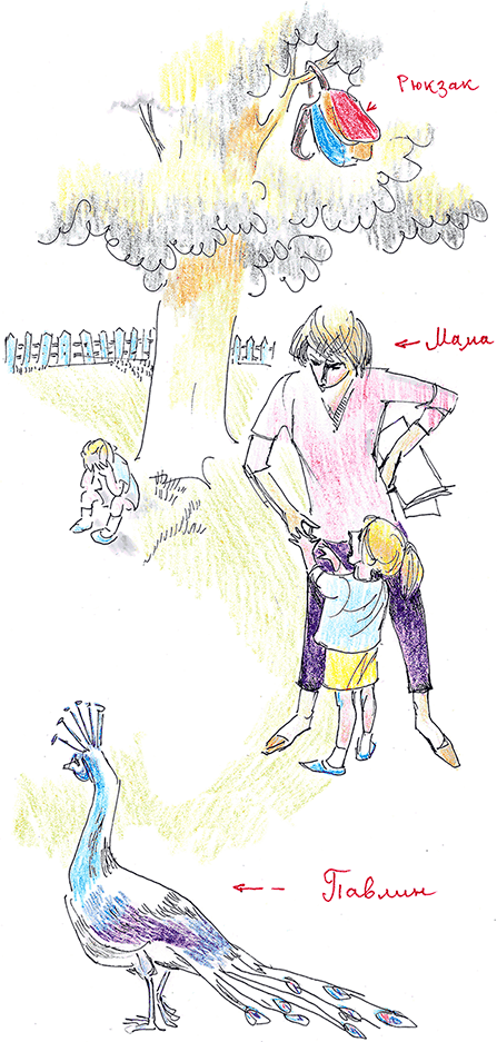 Она бросила петельку в бурьян у забора. Маша расплакалась, но мама её шлёпнула. Павлин подбежал, клюнул петельку и тут же с отвращением выплюнул.
